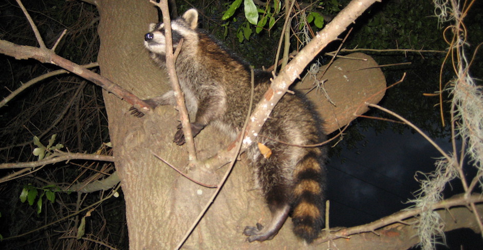 Raccoons are nocturnal and usually solitary, unless they congregate at man-made food sources such as picnic areas or campgrounds. They prefer brushy, thickly vegetated habitats, but adapt very well to the many artificial ponds, lakes, and wetlands found in the suburbs and housing developments. They can eat almost anything; their dexterous paws can easily open garbage cans, so they can readily take advantage of discarded food.